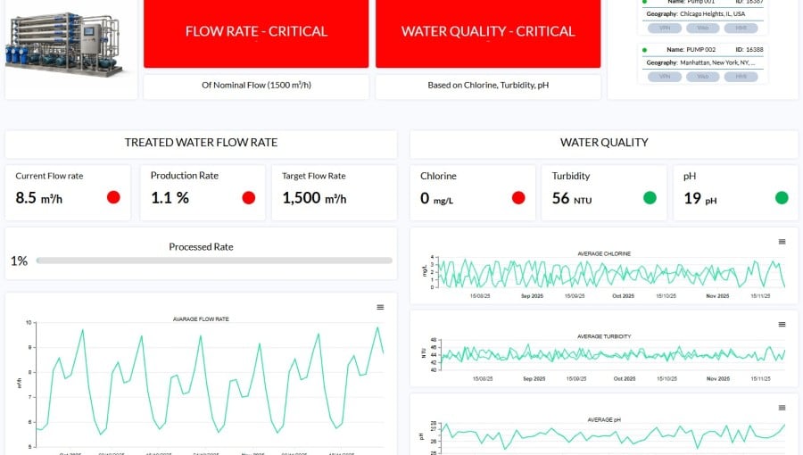 This dashboard enables multi-site monitoring of pump service activities including filter replacement, and leak detection. Service teams can quickly drill down into site-specific detailed dashboards for pressure trends, pump history, and maintenance forecasting